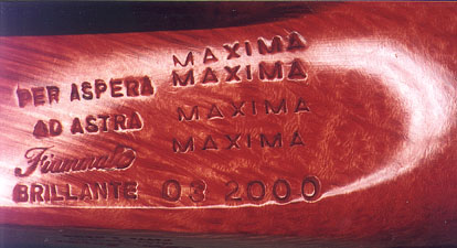 The stamping of 03/2000 indicates this was the third Gem Series Diamond made in the year 2000. The 4 x Maxima stamping indicates that it is very large. How large - think grapefruit bordering on canteloupe. "Fiammate" indicates it is a straight grain. "Per Aspera ad Astra" is the Ser Jacopo motto and is found stamped on all Ser Jacopo pipes. Gracefully translated from Latin it means, "Success through hard work". This Latin phrase was also the original motto of NASA. They translated it to mean, "To the stars through travails." One can also find the phrase in the coat of arms on a pack of Pall Mall cigarettes, though we aren't sure how they make the translation. Photo ref: TPBBC |
