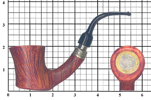 As most already know, the European Union made a gigantic step toward economic unification at the beginning of 2002. thus simplifying commercial, economic and recreational transactions in countless ways. He no longer needs a billfold of Francs, Marks, Guilders and many other currencies for his numerous border crossings. The Lira was often the butt of jokes, and being nondecimal in nature could also be confusing to tourists, but anyone who has had the pleasure of traveling in Italy will remember the first time they has £it 1.000.000 in their hands! It is an edition limited to but 200 pieces, and is packaged is a furniture grade wood box. Each of the pipes has a genuine Italian £it 1.000 coin imbedded into the bottom of the bowl. The silver band mounted on the shank is inscribed with the symbol for the Lira as well. Rustic/Sandblast Walnut Smooth Natural Smooth (shown) will understandably be quite strong. If you are interested in more information on this pipe, or would like to order one (if still available) please contact us directly or through your dealer. Photo ref: VLE_ciaolira |